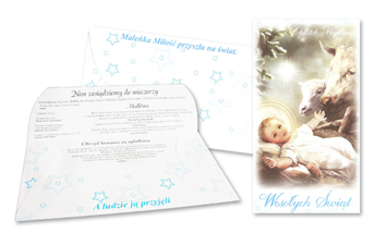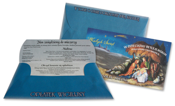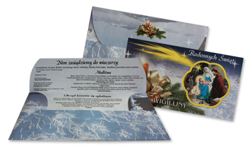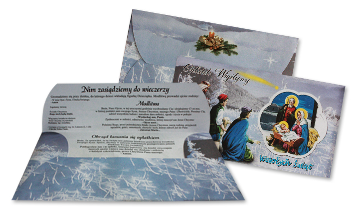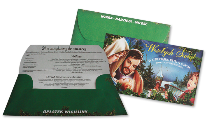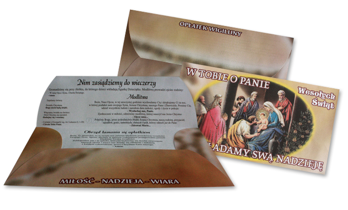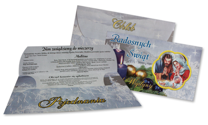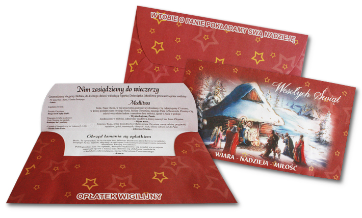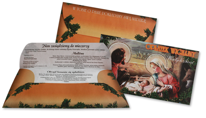 Komplet opłatków zapakowanych w kopertę papierową z kolorowym nadrukiem oraz dodatkowo w woreczek foliowy. Wewnątrz koperty znajduje się modlitwa oraz opis obrzędu łamania się opłatkiem. Zestaw w opakowaniu: 2 duże opłatki + 2 małe opłatki lub dowolny zestaw według zamówienia klienta.